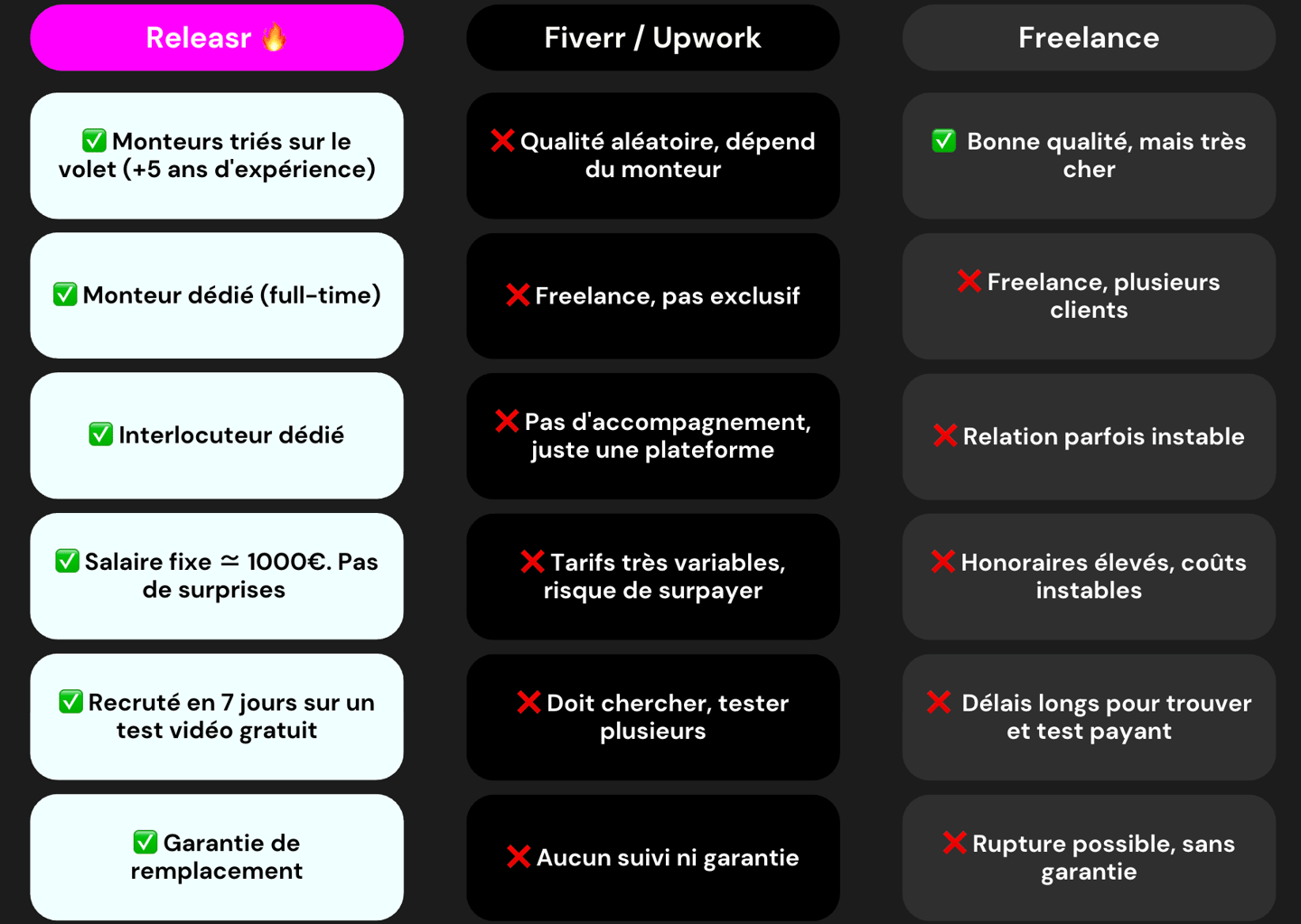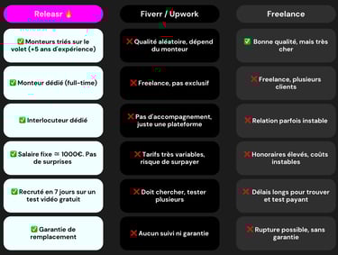 🔴 Option 1 : Les freelances ? 50 à 100€ par vidéo… Qualité moyenne, délais trop longs.